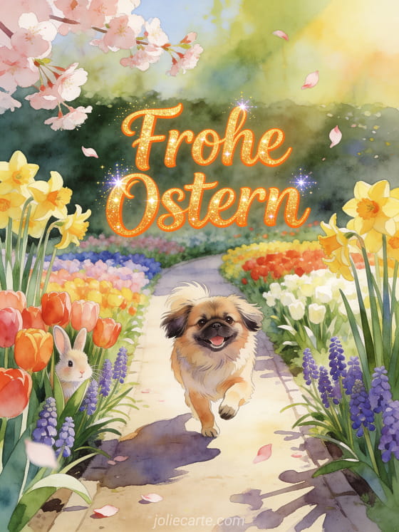 Entdecke diese schönen Osterkarten kostenlos mit einem Hasen, Pekinesen und Frühlingsblumen. Entdecke auch GIF Küsse Ostern oder Frohe Ostern Bild.