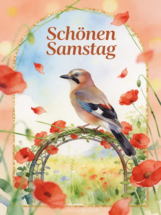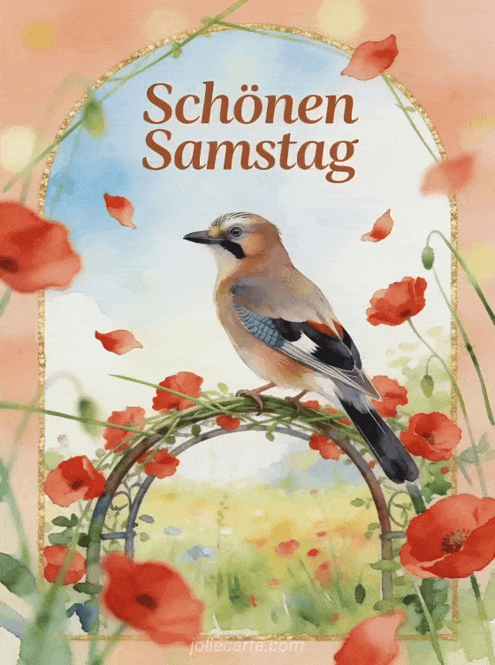 Teile einen farbenfrohen Gruß zum Samstag mit einer zarten Aquarellszene voller Mohnblumen und warmer Wiesenstimmung. Entdecke auch ein Schönen Samstag und schönes Wochenende animiertes GIF, ein Samstag schöner Tag Bild oder schönen samstag gif bilder.