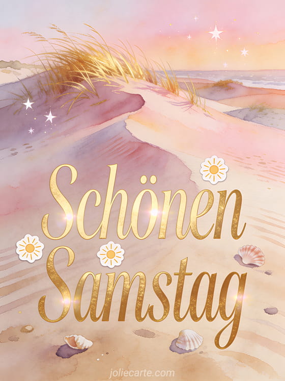 Senden Sie eine schöne Karte zum Samstag mit eleganten goldenen Buchstaben, kleinen Sonnen, Muscheln und einem wilden Strand, an dem vom Wind geformte Dünen im rosigen Morgenlicht leuchten. Entdecken Sie auch Landschaft hallo Samstag, hab einen schönen Samstag oder schönen Samstag dicke Küsse.