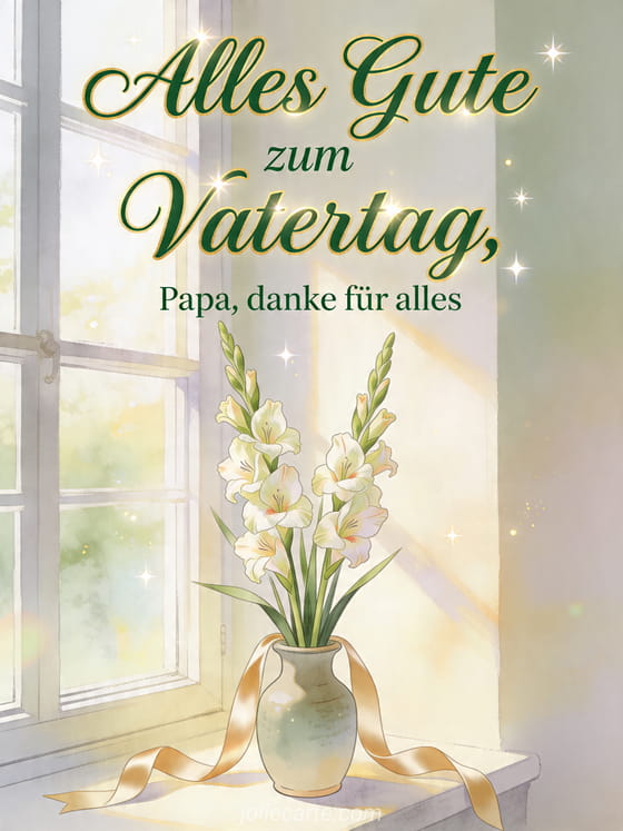 Senden Sie eine schöne Vatertagskarte mit raffinierter waldgrüner Kalligrafie, goldenem Rand und einer zarten botanischen Illustration hoher Gladiolen in einer Keramikvase nahe einem sonnigen Fenster mit Satinschleifen. Entdecken Sie auch Alles Gute zum Vatertag an alle Papas, Vatertag du fehlst mir oder eine fröhliche Vatertagskarte.
