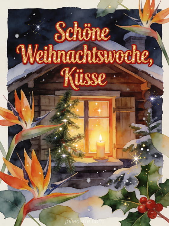 Wünsche eine schöne Weihnachtswoche mit tiefroter Aquarellschrift, Strelitzienblüten, Stechpalmenblättern, Tannenzweigen, einem leuchtenden Chaletfenster und warmen Kerzentönen. Entdecke auch eine Karte für Küsschen und schöne Woche, eine Karte für Küsschen zum Montag schöne Woche oder eine Karte für dicke Küsse schöne Woche.