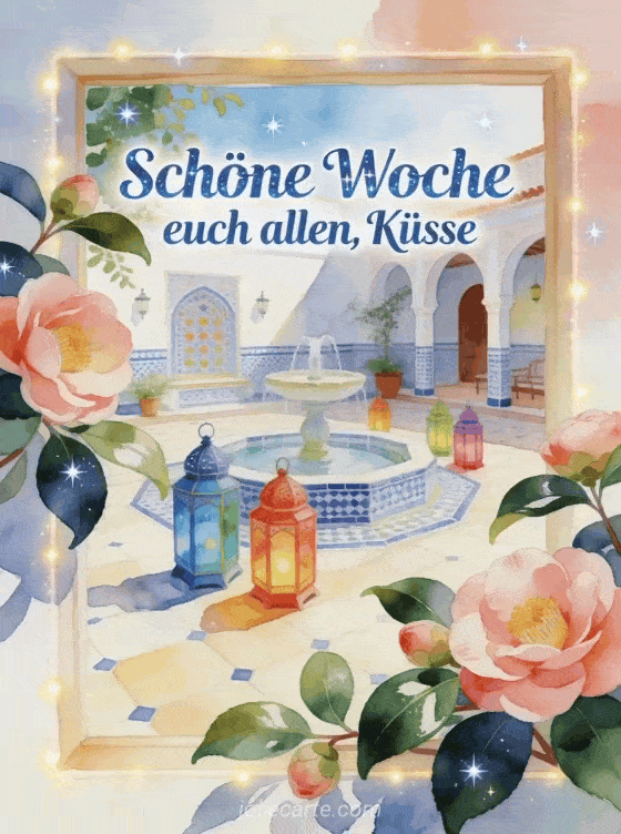 Wünsche allen eine schöne Woche mit saphirblauer Aquarellschrift, Kamelienblüten, glänzenden Blättern, einem gefliesten Brunnen und bunten Laternen. Entdecke auch eine Karte für schöne Woche für dich Küsse, eine Karte für schöne woche euch allen oder eine Karte für lustige schöne woche.
