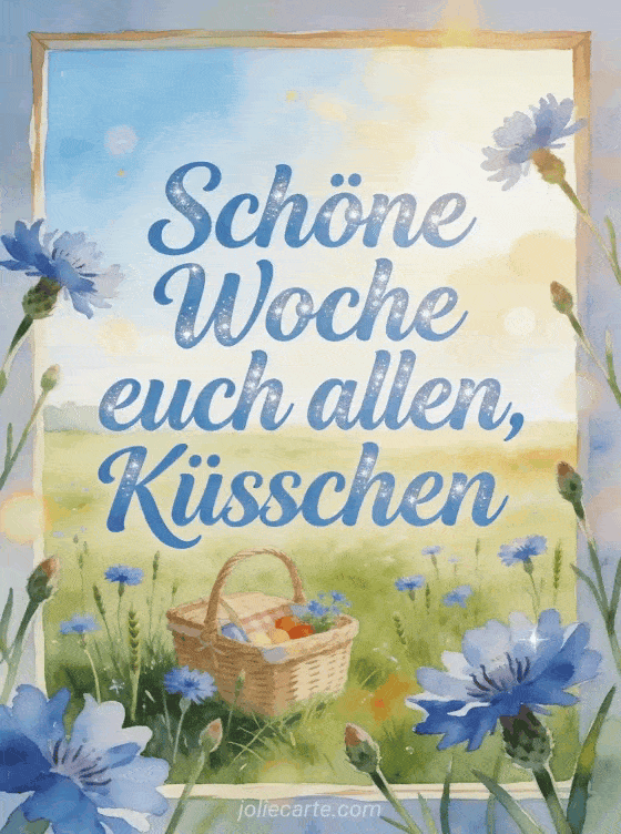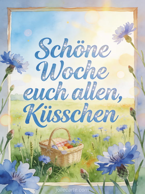 Sende einen herzlichen Gruß zur schönen Woche an alle mit einem Picknickkorb zwischen Kornblumen, einer grünen Wiese und hellem offenem Himmel. Entdecke auch eine animierte GIFs schöne Woche Küsschen, eine schöne Woche Küsse oder eine sonnige woche.