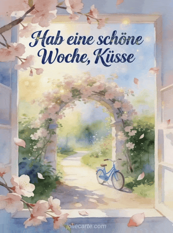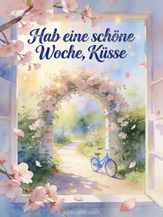 Teile einen hellen Start in die Woche mit einem Aquarell-Gartenweg, Kirschblüten, zarten Blütenblättern und einem kleinen blauen Fahrrad. Dazu passen auch schöne woche euch allen, lustige schöne woche oder guten tag und schöne woche.