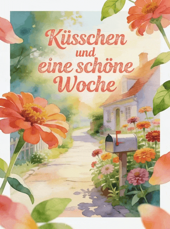 Verschicke eine schöne Woche GIF-Karte mit einem Dorfweg, einem kleinen Briefkasten und leuchtenden Zinnien im warmen Morgenlicht. Entdecke auch eine schöne Woche dir auch Küsse, schöne Woche dicke Küsse oder Küsse für die ganze Woche.