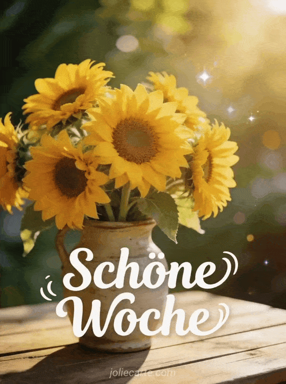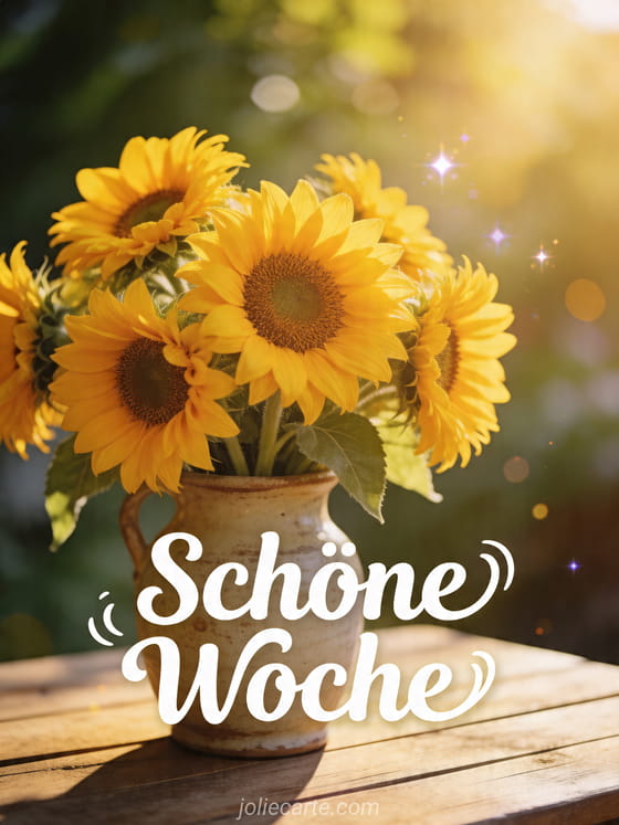Teile mit dieser kostenlosen Karte eine fröhliche Schöne Woche Botschaft mit einem rustikalen Strauß Sonnenblumen in einer Keramikvase auf einem Holztisch. Entdecke auch bild hallo schöne woche, animierte schöne woche gif gif oder entspannte woche.