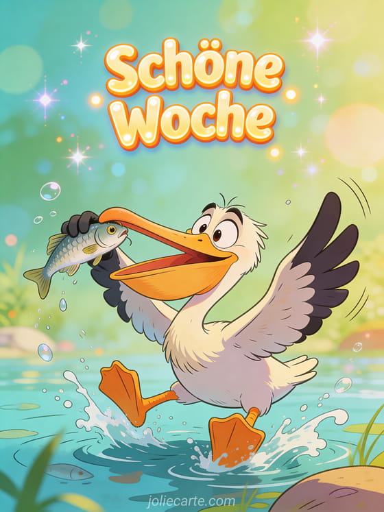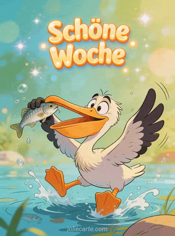 Sende eine lustige animierte Schöne-Woche-Karte und bringe jemanden zum Lachen. Ein tollpatschiger Pelikan der Fische zu fangen versucht mit einem lustigen Gesichtsausdruck ist der perfekte humorvolle Wochenwunsch. Entdecke auch Bilder schöne woche oder ein gif schöne woche lustig.