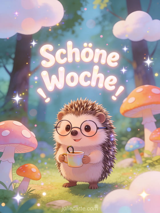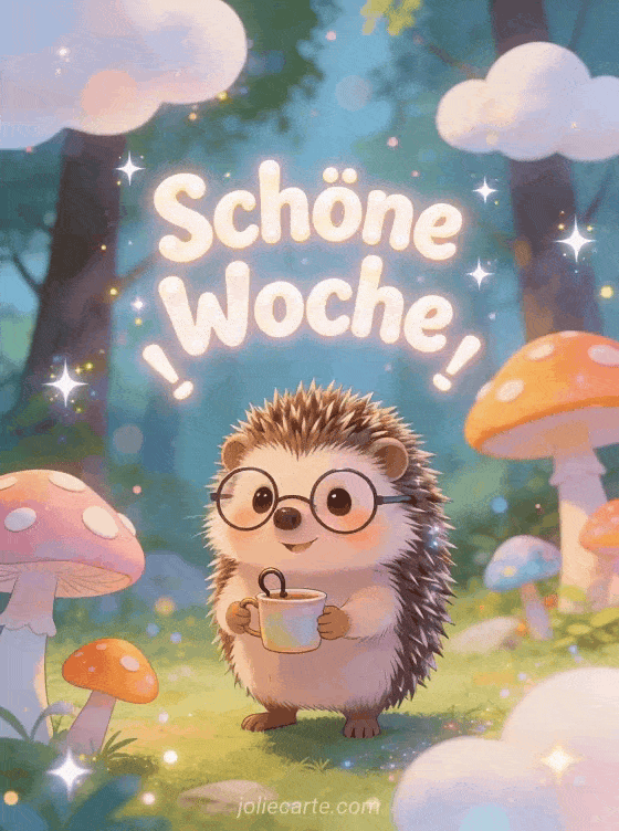 Senden Sie einen fröhlichen Wochengruß mit einem niedlichen Igel mit winziger Brille und einer Tasse in einem malerischen Wald. Eine spaßige Art, jemandem eine wunderbare Woche zu wünschen. Entdecken Sie auch eine Karte guten Morgen schöne Woche oder ein schöne Woche GIF.