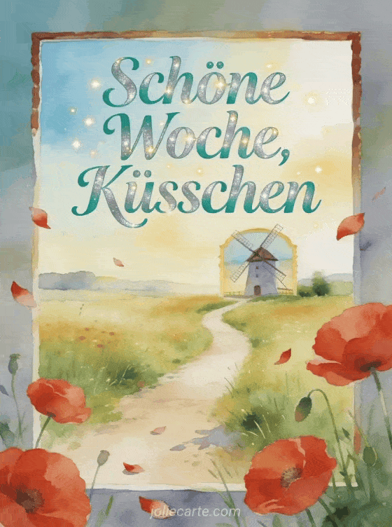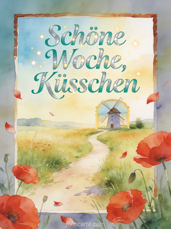 Teile einen aufmunternden Landgruß mit roten Mohnblumen, treibenden Blütenblättern, einem sonnigen Wiesenweg und einer kleinen Mühle in sanftem Goldlicht. Dazu passen sehr schöne Woche Küsse, schönen Montag schöne Woche Küsschen oder schöne Weihnachtswoche Küsse.