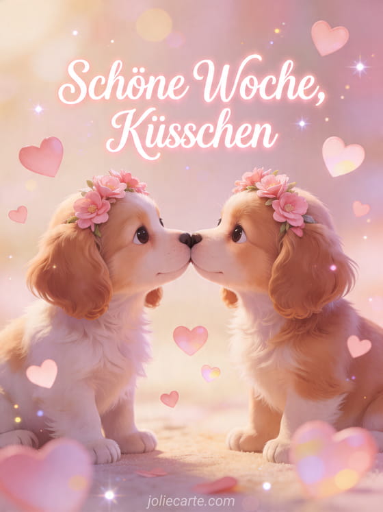 Teilen Sie diese zarte Karte Schöne Woche, Küsschen mit zwei süßen Welpen, die sich mit den Nasen berühren, Blumenkränzen und schwebenden Herzen. Entdecken Sie auch schöne woche nachricht, glitzernde schöne woche gif und schöne Woche Bild kostenlos.