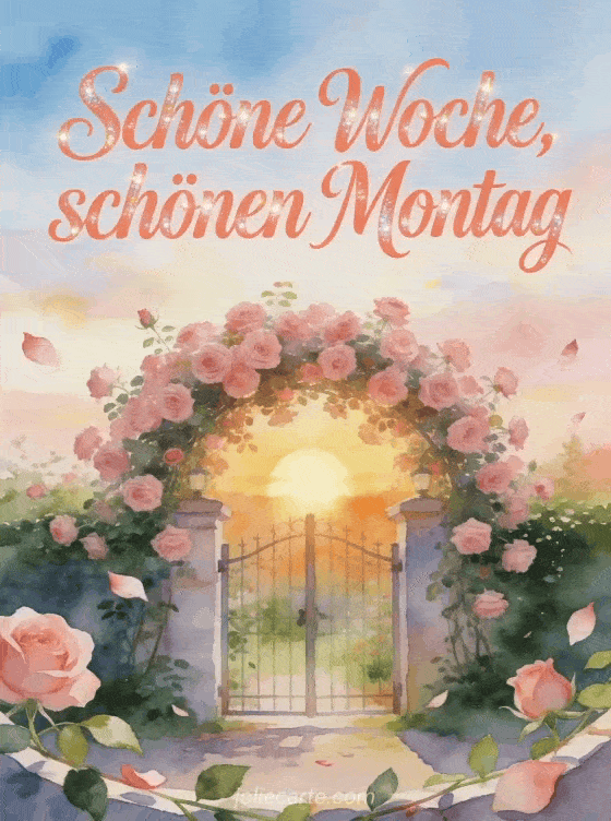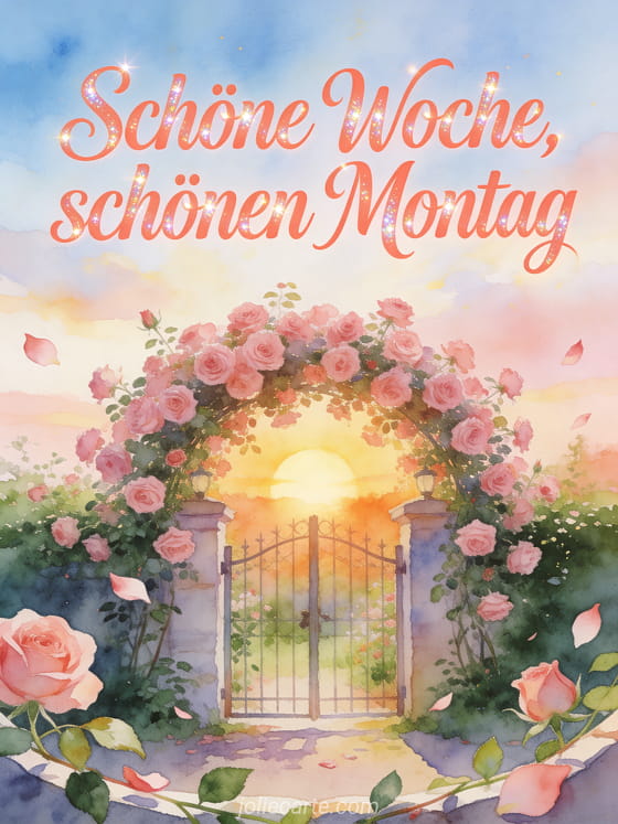 Sende einen ermutigenden schöne Woche und schönen Montag Gruß mit Sonnenaufgang über einem kleinen Gartentor voller rosa Rosen, Blütenblätter und belaubter Stiele. Entdecke auch Guten Morgen Montag Guten Morgen Bild, ein Schönen Montag animiertes Bild oder ein Schönen Montag viel Erfolg Bild.