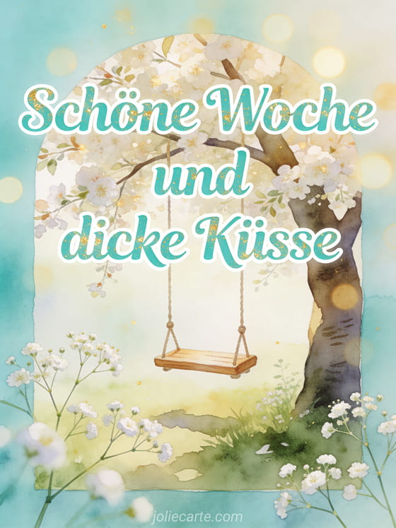 Wünsche eine schöne Woche mit runder türkisfarbener Aquarellschrift, winzigen weißen Schleierkrautblüten, einer kleinen Holzschaukel unter einem blühenden Baum, sanftem goldenen Licht und luftigem Bokeh. Entdecke auch eine Karte für Woche Küsschen, eine Karte für Küsse schöne Woche oder eine Karte für schöne Woche Küsse GIF.