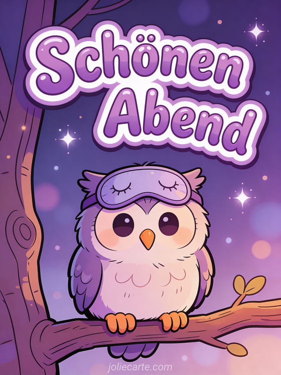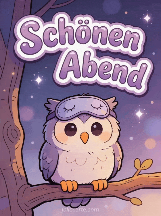 Schick eine lustige Schönen-Abend-Karte mit einer witzigen Eule mit dieser kostenlosen Grußkarte. Entdecke auch Schönen Abend Bild mit Küssen oder schöner Abend am Kamin.