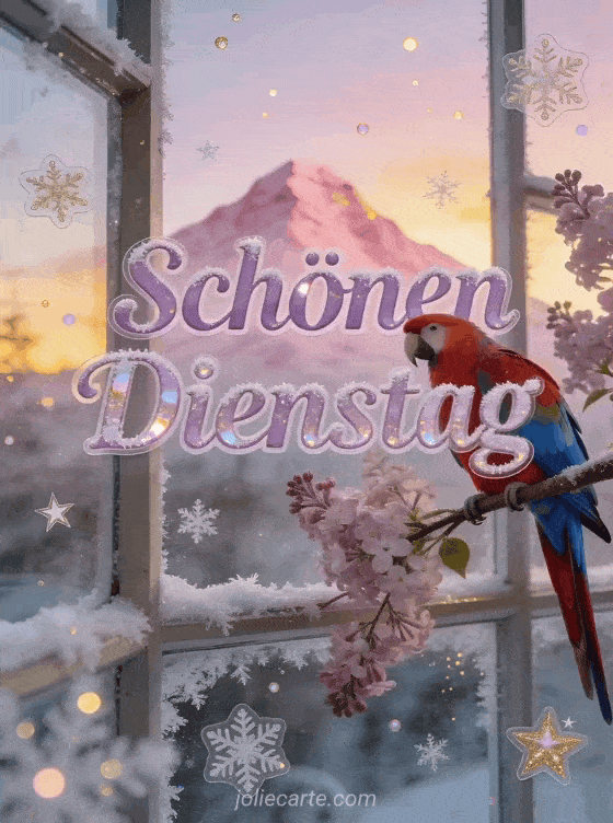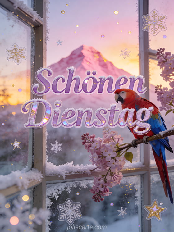 Senden Sie eine magische Karte zum schönen Dienstag mit fliederfarbenen Buchstaben, frostigen Reflexen, zarten Schneeflocken und eisigen Sternen, einem rosa Berg bei Sonnenuntergang, glitzerndem Frost am Fenster und einem rot-blauen Ara auf einem blühenden Fliederzweig. Entdecken Sie auch Schönen Dienstag Katzenbild, Schönen Dienstag Sonne Bild oder Schönen Dienstag Landschaft Bild.