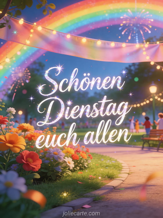 Teile schönen Dienstag euch allen mit fließender Kalligrafie, einem Regenbogenbanner über einer fröhlichen Parkszene, hellen Blumen und feierlichen Lichtern. Dazu passen Schönen Dienstag Tiere GIF, Schönen Dienstag schöne animierte Bilder oder Schönen Dienstag Regen Bild.