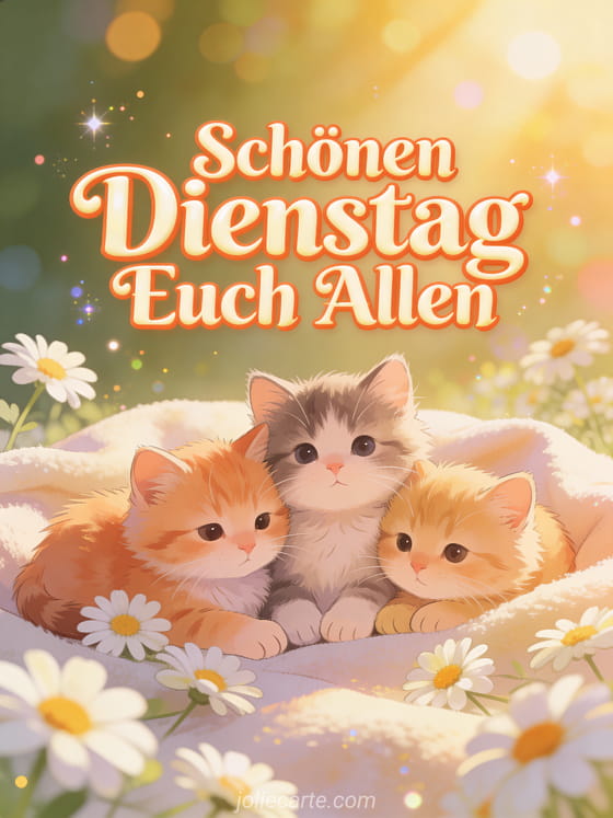 Wünschen Sie allen einen schönen Dienstag mit dieser bezaubernden Grußkarte. Drei süße Kätzchen kuscheln sich auf einer weichen Decke umgeben von Gänseblümchen. Entdecken Sie auch eine Schönen Dienstag Karte, eine Schönen Tag Karte oder eine Dienstagsgruß Karte.