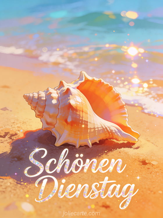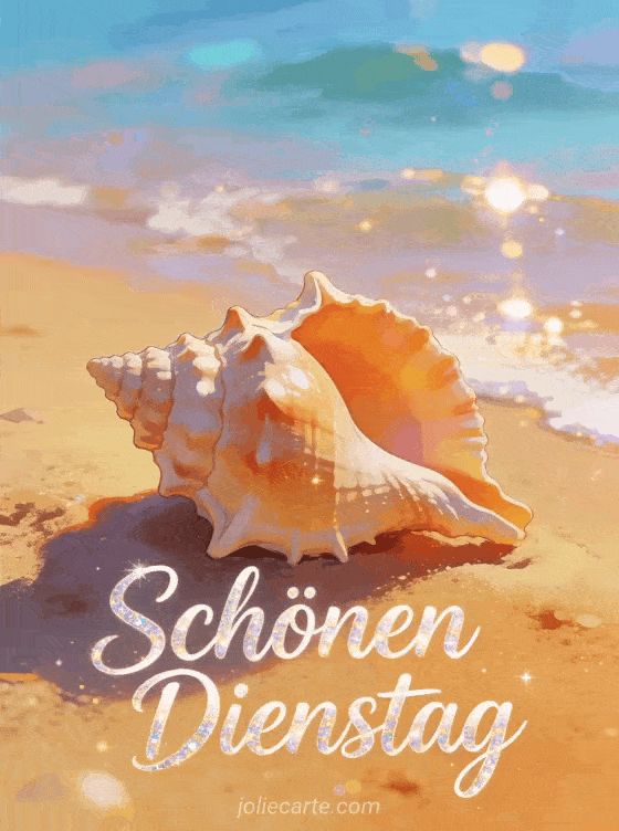 Teile schöne Dienstag Facebook Bilder mit lebendiger Kalligrafie, einer hellen Muschel auf warmem Sand und glitzernden Meeresspiegelungen. Dazu passen Schönen Dienstag bei Regen Bild, Schönen Dienstag GIFs oder Schönen Dienstag bei Regen GIF.