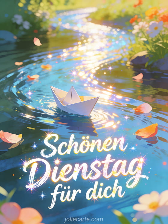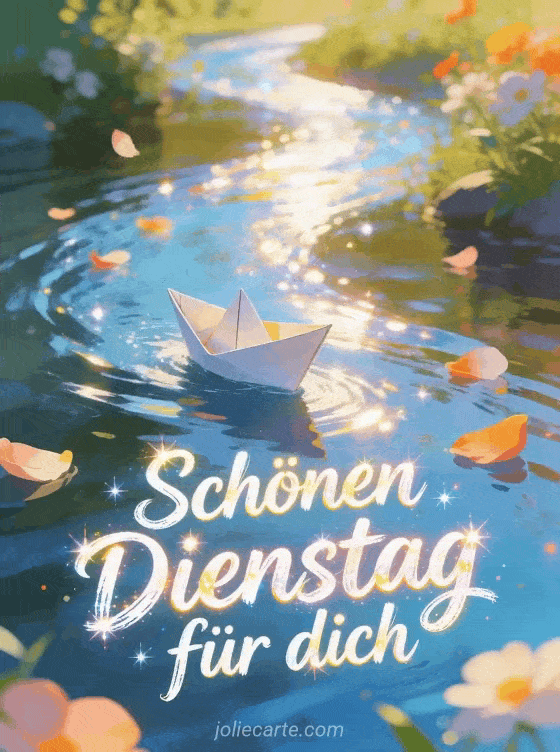 Teile schöne Dienstag GIFs mit fröhlicher Pinselschrift, einem Papierboot auf einem hell spiegelnden Bach und treibenden Blütenblättern. Dazu passen Schönen Dienstag bei Regen GIF, Schönen Dienstag Schmetterling GIF oder Schönen Dienstag Bilder kostenlos.