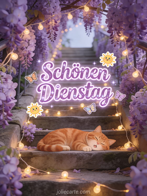Senden Sie eine lustige Karte zum schönen Dienstag mit verspielten violetten Buchstaben, kleinen Sonnen, frechen Schmetterlingen und Steintreppen unter herabfallender mauvefarbener Glyzinie, blockiert von einer selig schlafenden roten Katze. Entdecken Sie auch virtuelle Schönen-Dienstag-Karte, Guten Morgen schönen Dienstag Bild oder Schönen Dienstag Karte.