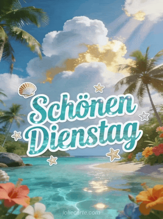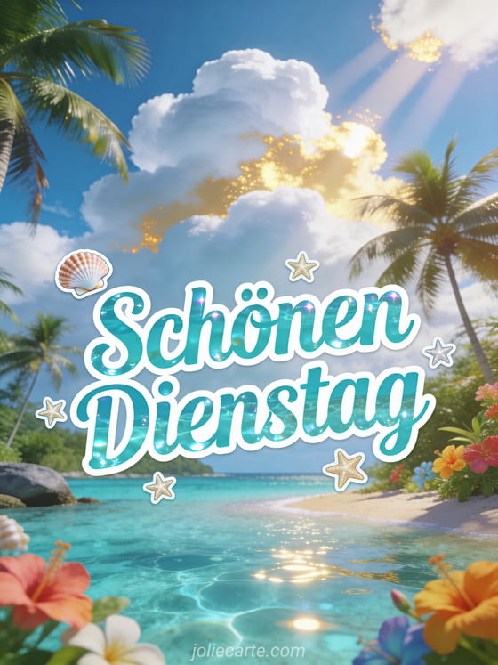 Verschicke einen leuchtenden Gruß zum Dienstag mit türkisfarbener Schrift, Muschel- und Seestern-Stickern, einer tropischen Bucht mit kristallklarem Wasser, Palmen, bunten Blumen und goldenen Sonnenstrahlen zwischen weißen Wolken. Dazu passen auch dieses lustiges Schönen-Dienstag-Bild Humor, dieses Schönen Dienstag Bild oder diese Guten Morgen Dienstag Karte.