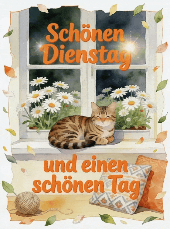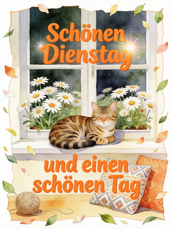Teile einen gemütlichen Dienstagsgruß mit einer Bengalkatze am Fenster, Margeriten, einem Wollknäuel und gemusterten Kissen. Entdecke auch ein Guten Morgen schönen Dienstag GIF, schönen Dienstag Karten oder ein Schönen Dienstag glitzerndes Bild.