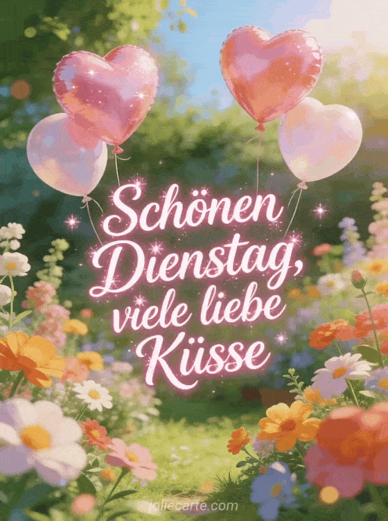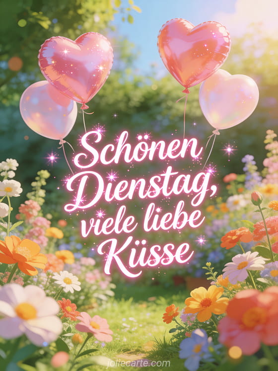 Verschicke einen zärtlichen Gruß zum Dienstag mit runder rosa Glitzer-Kalligrafie, Herzluftballons über einem hellen bunten Garten, warmem Leuchten und leichtem Glitzer. Dazu passen auch dieses Schönen-Dienstag-Bild Küsschen, dieses Schönen Dienstag Humor Bild oder diese virtuelle Schönen-Dienstag-Karte.