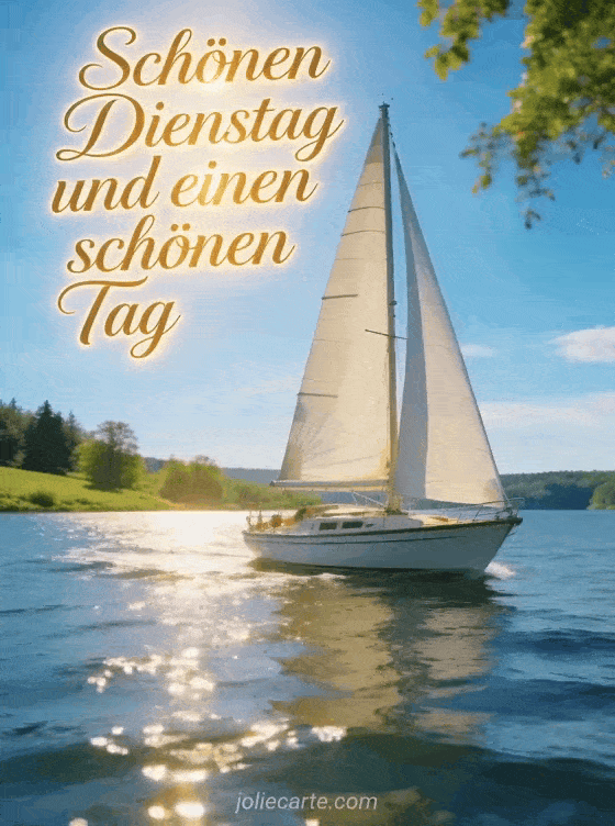 Verschicke einen herzlichen Gruß zum Dienstag mit eleganter leuchtender Schrift, einem Segelboot auf einem glitzernden See unter hellem Himmel, grünen Ufern und natürlichem realistischem Licht. Dazu passen auch dieses schönen Dienstag Tag GIF, diese Schönen Dienstag Küsse Bilder kostenlos oder dieses Schönen-Dienstag-Bild Küsschen.