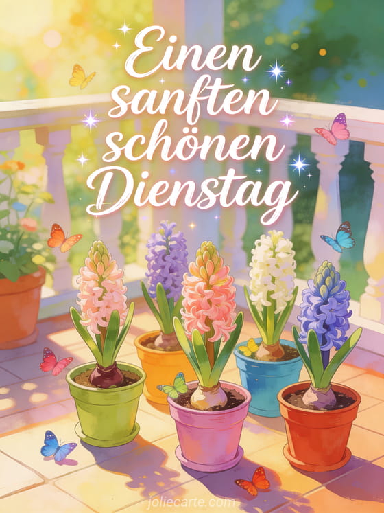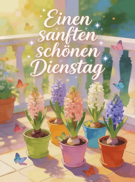 Teile schöne animierte Bilder für schönen Dienstag mit fließender Pinselschrift, Hyazinthentöpfen auf einer sonnigen Terrasse und bunten Schmetterlingen im Licht. Dazu passen Schönen Dienstag Regen Bild, Schönen Dienstag Facebook Bilder oder Schönen Dienstag bei Regen Bild.