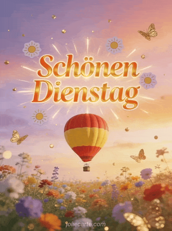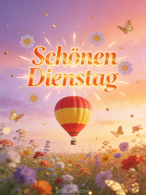 Senden Sie eine herzliche Karte zum schönen Dienstag mit goldorangefarbenen Buchstaben, kleinen Sonnen, goldenen Schmetterlingen und einem rot-gelben Heißluftballon über einem bunten Blumenfeld bei pastelligem Sonnenuntergang. Entdecken Sie auch Schönen Dienstag Landschaft Bild, schönen Dienstag Tag GIF oder Schönen Dienstag Küsse Bilder kostenlos.