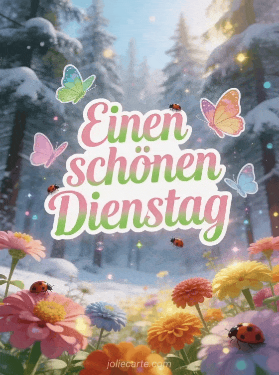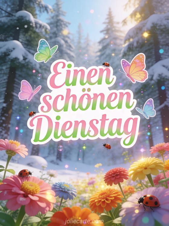 Senden Sie eine farbenfrohe Karte für einen schönen Dienstag mit frühlingsrosa Buchstaben, grünen Akzenten, Schmetterlingen und Marienkäfern, während bunte Zinnien vor einem verschneiten Tannenwald in einem magischen Übergang von Winter zu Frühling blühen. Entdecken Sie auch Schönen Dienstag Küsse Bilder kostenlos, Schönen-Dienstag-Bild Küsschen oder Schönen Dienstag Humor Bild.