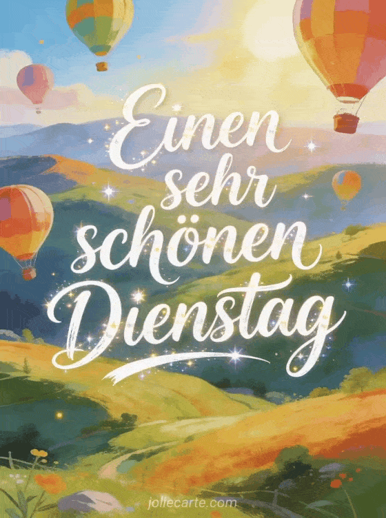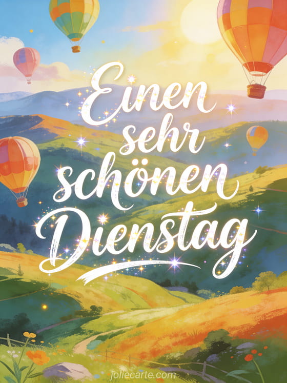 Teile eine virtuelle Karte für schönen Dienstag mit gemalter Kalligrafie, bunten Heißluftballons über einem sonnigen Tal und sanften Hügeln. Dazu passen Schönen Dienstag GIF, Dienstag Küsse GIF oder Schönen Dienstag Bild kostenlos.