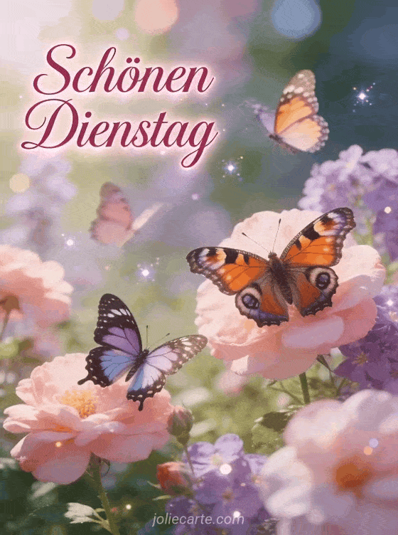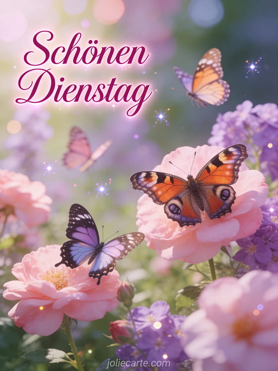 Verschönern Sie Ihren Dienstag mit dieser wunderschönen Karte. Bunte Schmetterlinge tanzen zwischen blühenden Blumen in einer zarten femininen Atmosphäre mit sanften Rosa- und Lilatönen. Entdecken Sie auch eine Karte für schönen Dienstag oder eine Grußkarte für schönen Dienstag.