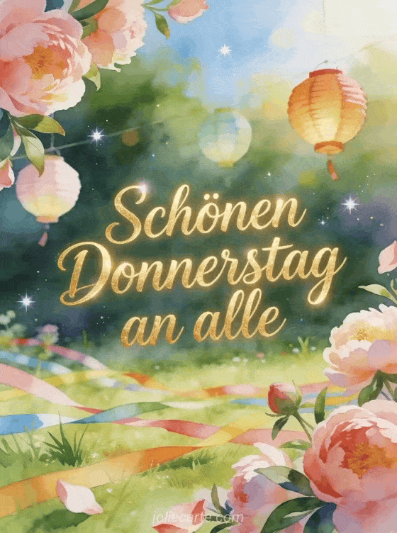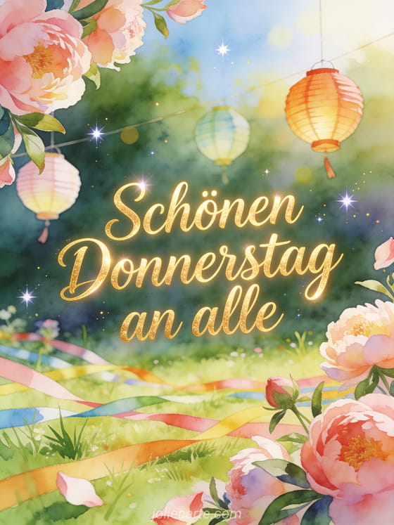 Sende einen festlichen schönen Donnerstag Gruß an alle mit einer hellen Feier auf der Wiese, Papierlaternen, Pfingstrosenblüten und bunten Schleifen über frischem Gras. Entdecke auch ein guten Morgen Donnerstag gif, kostenlose virtuelle schönen donnerstag karten oder ein schönen donnerstag foto.