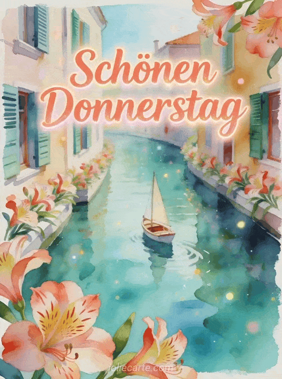 Sende einen fröhlichen Donnerstagswunsch mit korallfarbener Schrift, einer Kanalszene, einem kleinen Segelboot, bemalten Fensterläden und Alstroemerienblüten über dem Rand. Entdecke auch Guten Morgen schönen Donnerstag Küsschen Bilder, ein Guten Morgen schönen Donnerstag Zitat oder einen Text um einen schönen Donnerstag zu wünschen.