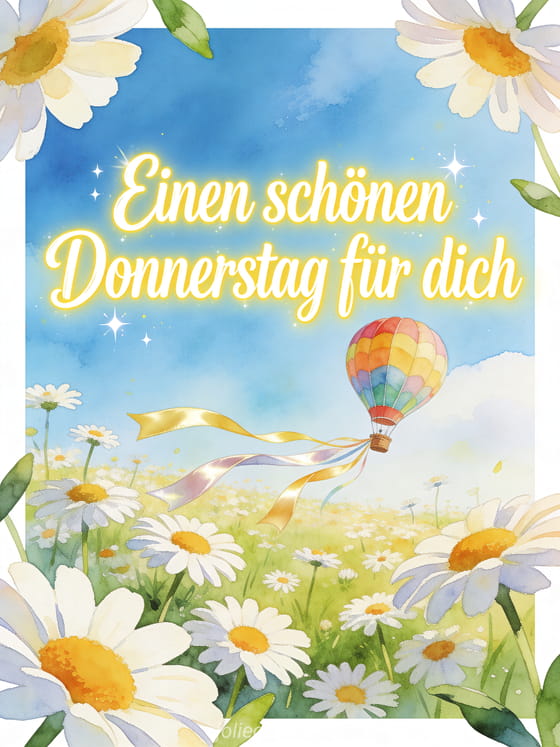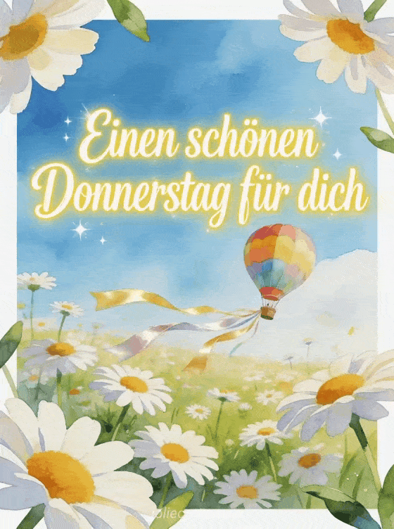 Sende einen schönen Donnerstag für dich mit leuchtend gelber Schrift, einem bunten Heißluftballon, Margeriten und Schleifen über einer hellen Wiese. Entdecke auch schönen Donnerstag Herzbilder, Schönen Donnerstag Sonne Bild oder Schönen Donnerstag rotes GIF.
