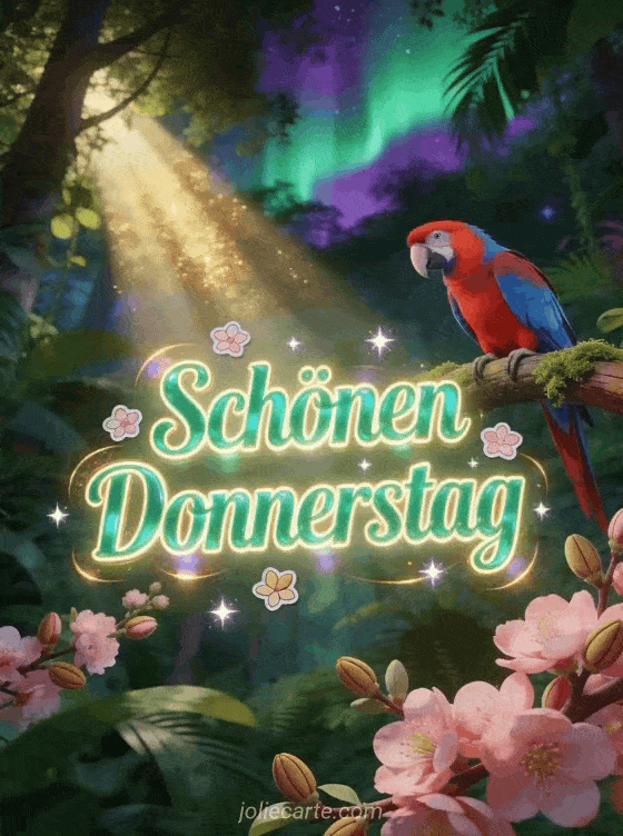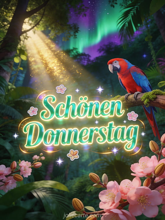 Senden Sie eine Karte zum schönen Donnerstag mit smaragdgrünen Buchstaben, Mandelblüten, funkelnden Sternen und einem rot-blauen Ara in einem tropischen Wald unter grün-violettem Polarlicht. Entdecken Sie auch positiver Gedanke positives Zitat schönen Donnerstag, Schöner Tag am Donnerstag Bilder oder Schönen Donnerstag mit Rosen Bilder.
