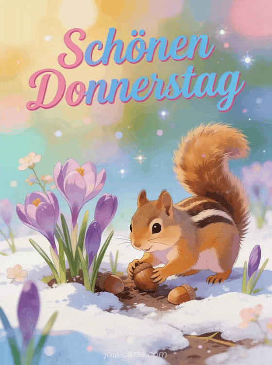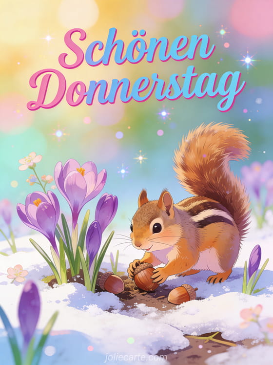 Erhelle jemandem den Donnerstag mit dieser bezaubernden Karte mit einem fröhlichen Streifenhörnchen zwischen lila Krokussen im Schnee. Entdecke auch eine Karte ich wünsche dir einen schönen donnerstag, eine Karte schönen donnerstag wünschen oder eine Karte guten morgen donnerstag.