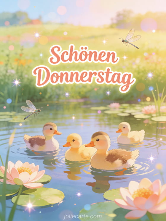 Teile schönen Donnerstag Bilder mit einer niedlichen Entenfamilie, die zwischen Seerosen und Libellen in einem ruhigen Teich auf dem Land schwimmt. Finde weitere Donnerstagsgrüße mit Schönen Donnerstag schönes Bild, Guten Morgen Donnerstag Humor oder Schönen Donnerstag im Regen Bild.