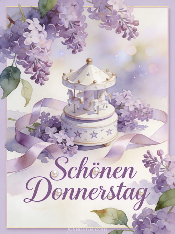 Wünsche einen schönen Donnerstag mit einer Spieluhr aus Porzellan, Sternmustern, Fliederblüten und Satinschleifen in sanftem Pastell-Aquarelllicht. Du kannst auch schönen Donnerstag Regen, Guten Morgen schönen Donnerstag und schönen Tag oder Schönen Donnerstag Blumenbilder senden.