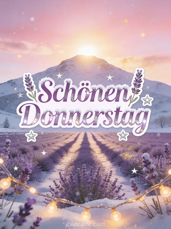 Sende Schönen Donnerstag Frau Bilder mit eleganten lavendelvioletten Buchstaben, silbernen Frostreflexen und einem endlosen Lavendelfeld vor einem verschneiten Berg. Teile einen poetischen Wunsch unter der Woche und entdecke auch Bild um einen schönen Donnerstag zu wünschen, Guten Morgen Donnerstag Bilder oder Donnerstag Küsschen Bilder.