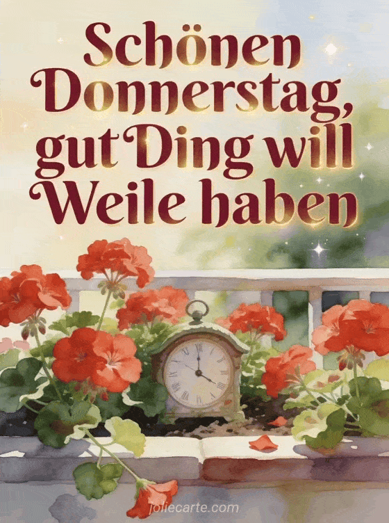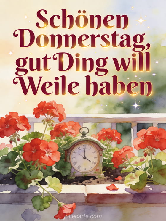 Teile eine geduldige und fröhliche Karte für einen schönen Donnerstag mit einer kleinen Gartenuhr zwischen roten Geranien auf einer sonnigen Terrasse. Entdecke auch einen Schönen Donnerstag Segen, ein schönen Tag am Donnerstag GIF oder ein Schönen Donnerstag Foto GIF.