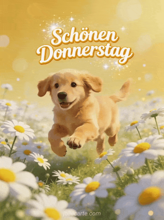 Sende einen fröhlichen Gruß zum schönen Donnerstag mit einem verspielten Golden-Retriever-Welpen, der durch ein Feld aus Margeriten springt, in sonniger Stimmung. Entdecke auch Guten Morgen schönen Donnerstag Sport Bild, Schönen regnerischen Donnerstag gif oder Karten um einen schönen Donnerstag zu wünschen.