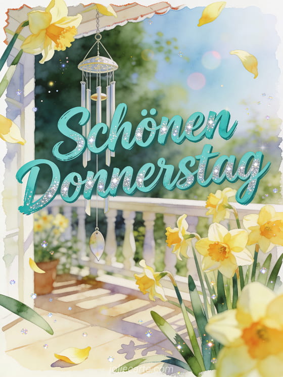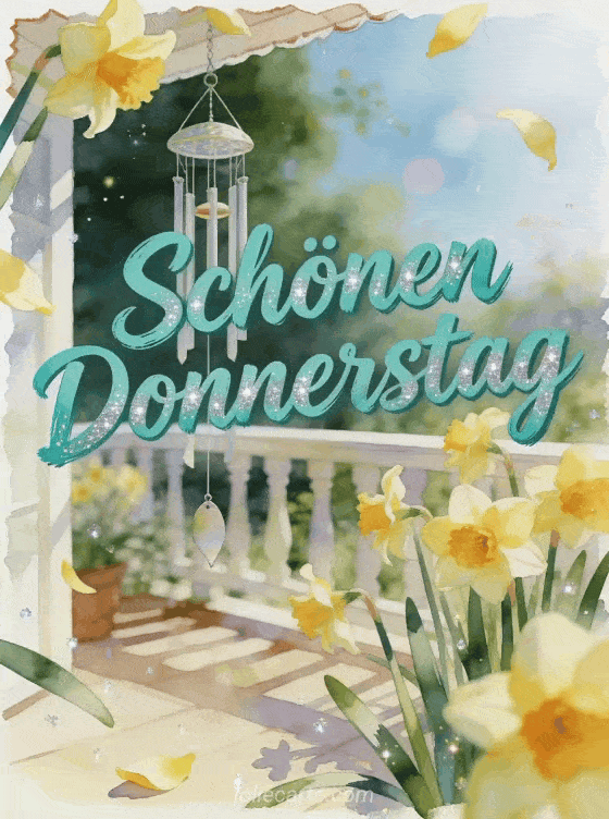 Sende einen hellen Donnerstagswunsch mit türkisfarbener Schrift, einer luftigen Terrasse, Narzissen, einem zarten Windspiel und funkelndem Bokeh. Entdecke auch ein Guten Morgen und schönen Donnerstag Bild, ein Schönen Donnerstag Kaffee GIF oder ein schönen Donnerstag Freunde Bild.
