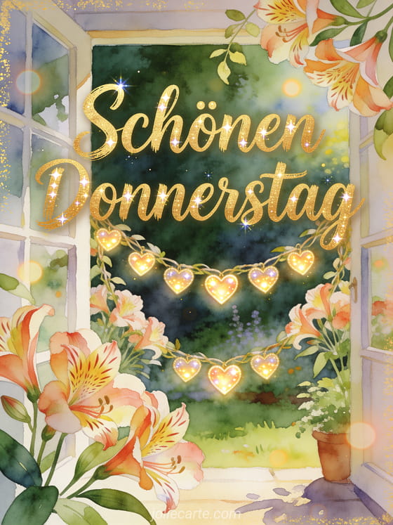 Teile eine Karte zum schönen Donnerstag mit goldener Schrift, leuchtenden Herzornamenten und Alstroemerien in einem Aquarellgarten. Entdecke auch Schönen Donnerstag Sonne Bild, Schönen Donnerstag rotes GIF oder animiertes GIF schönen Donnerstag Küsschen.