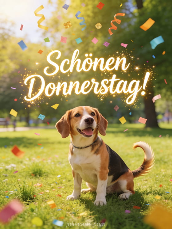 Verschicke einen fröhlichen Gruß zum Donnerstag mit lebendiger Schrift, goldenen Funken, einem verspielten Beagle-Hund in einem sonnigen Park und bunten Konfetti-Akzenten für eine helle Kartenstimmung. Dazu passen auch dieses Schönen Donnerstag Katze gif, diese Schönen Donnerstag virtuelle Karte oder diese Schönen Donnerstag Frau Bilder.
