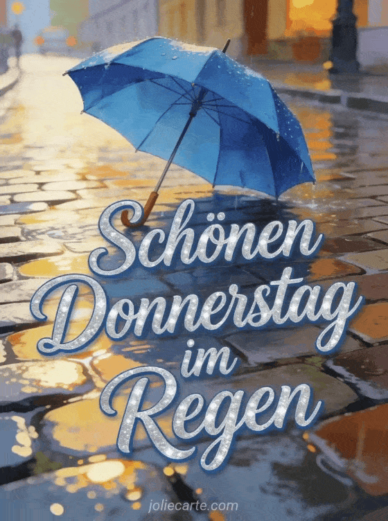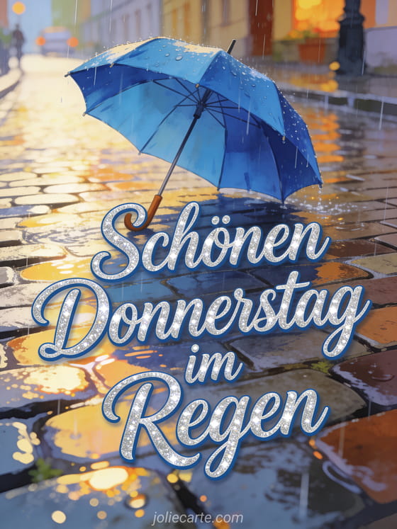 Teile ein schönes Donnerstag im Regen Bild mit silberner Schreibschrift, einem blauen Regenschirm auf nassen Pflastersteinen und hellen Spiegelungen. Dazu passen Schönen Donnerstag Küsse animierte GIFs, eine Schönen Donnerstag schöne Karte oder schönen Donnerstag schönen Tag.