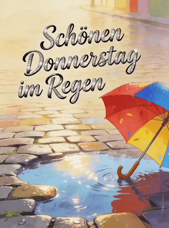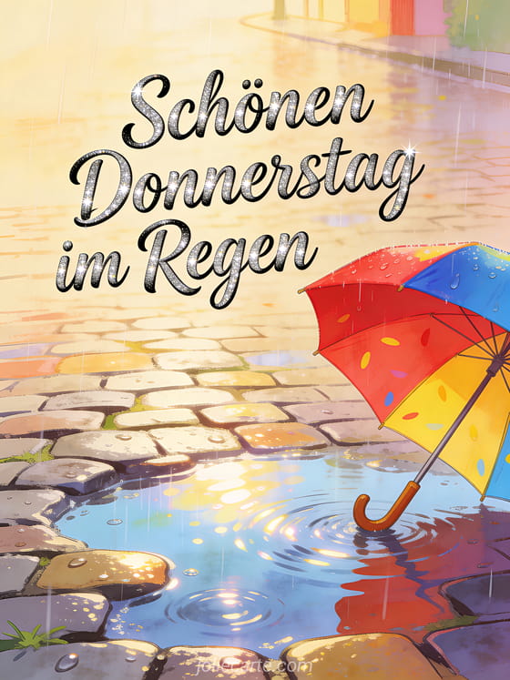 Teile einen schönen Donnerstag im Regen mit kräftiger Kursivschrift, silbernem Funkeln, einem bunten Regenschirm neben schimmernden Pfützen, nassem Kopfsteinpflaster und warmem Umgebungslicht. Entdecke auch kostenlose Schönen Donnerstag Bilder, Guten Morgen schönen Donnerstag Bild oder Guten Morgen schönen Donnerstag Küsse Bilder.