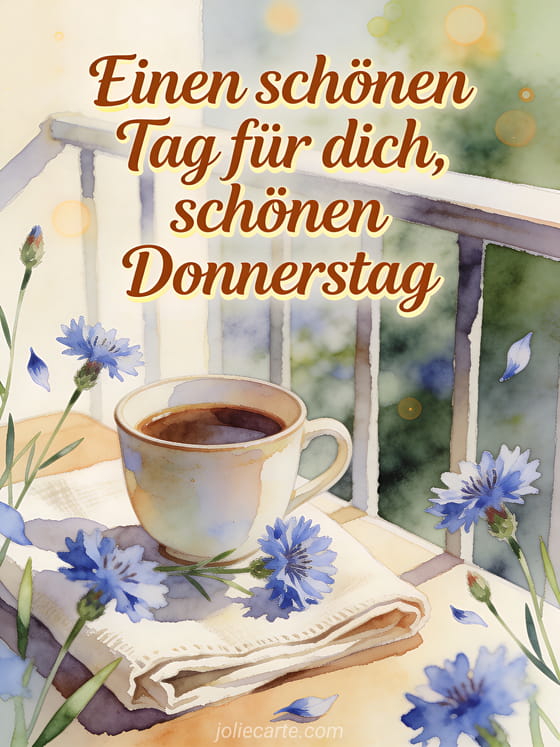 Teile ein gemütliches Bild für einen schönen Donnerstag mit Kaffee, einer Porzellantasse, Kornblumen und sanftem Balkonlicht. Du kannst auch ein Freund schönen Donnerstag Zitat, ein Schönen Donnerstag Zen Zitat oder einen schönen donnerstag text senden.