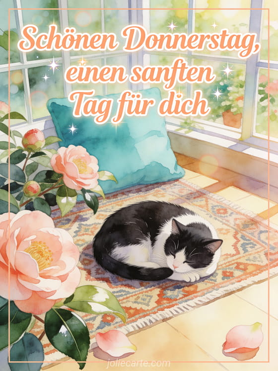 Wünsche einen sanften schönen Donnerstag mit einer gemütlichen schwarz-weißen Katze, Kamelien und warmem Aquarelllicht. Du kannst auch ein Bild zum Wünschen eines schönen Donnerstags, ein Schönen Donnerstag Kaffee Bild oder ein Freund schönen Donnerstag Zitat senden.