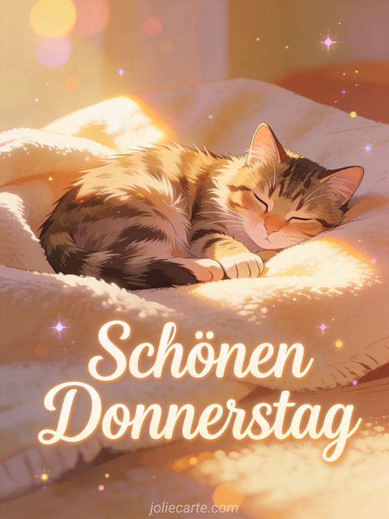 Teile schönen Donnerstag Katze mit einer flauschigen getigerten Katze, die zufrieden und schläfrig in einem Sonnenfleck auf einer sanften Decke liegt. Sende weitere ruhige Wünsche mit Karte schönen Tag Donnerstag, Schönen Donnerstag Nachricht oder schönen Donnerstag positives Zitat.